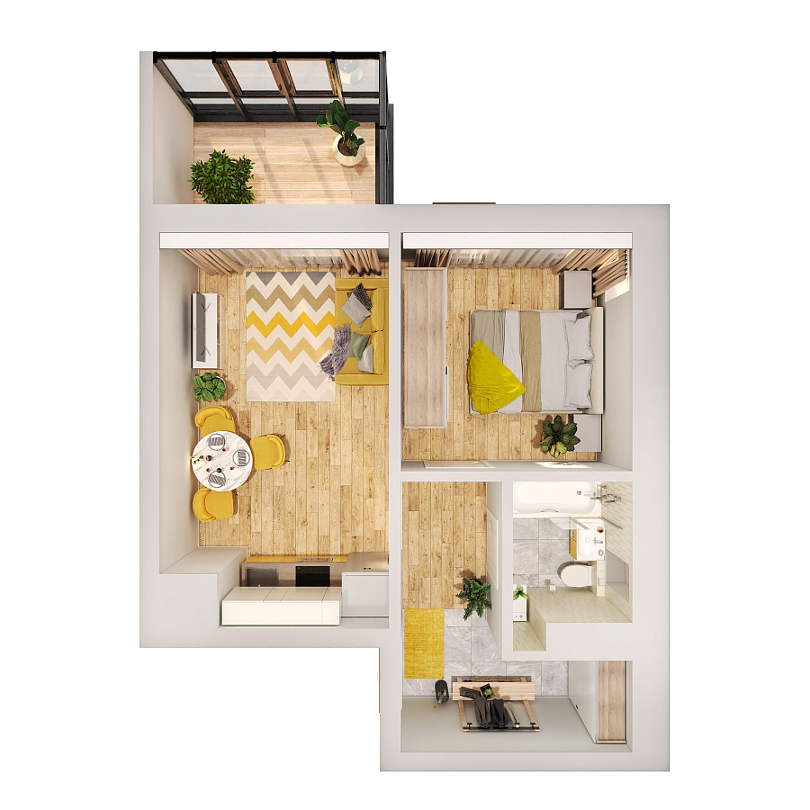 Визуализация и планировка, в том числе в части площади и размера стен жилого помещения, используемых цветовых решений на плане являются проектными и могут быть изменены в ходе строительства объекта. Цена квартиры зависит от выбранной программы и акции, актуальные цены можно уточнить у менеджеров и на момент заключения договора.