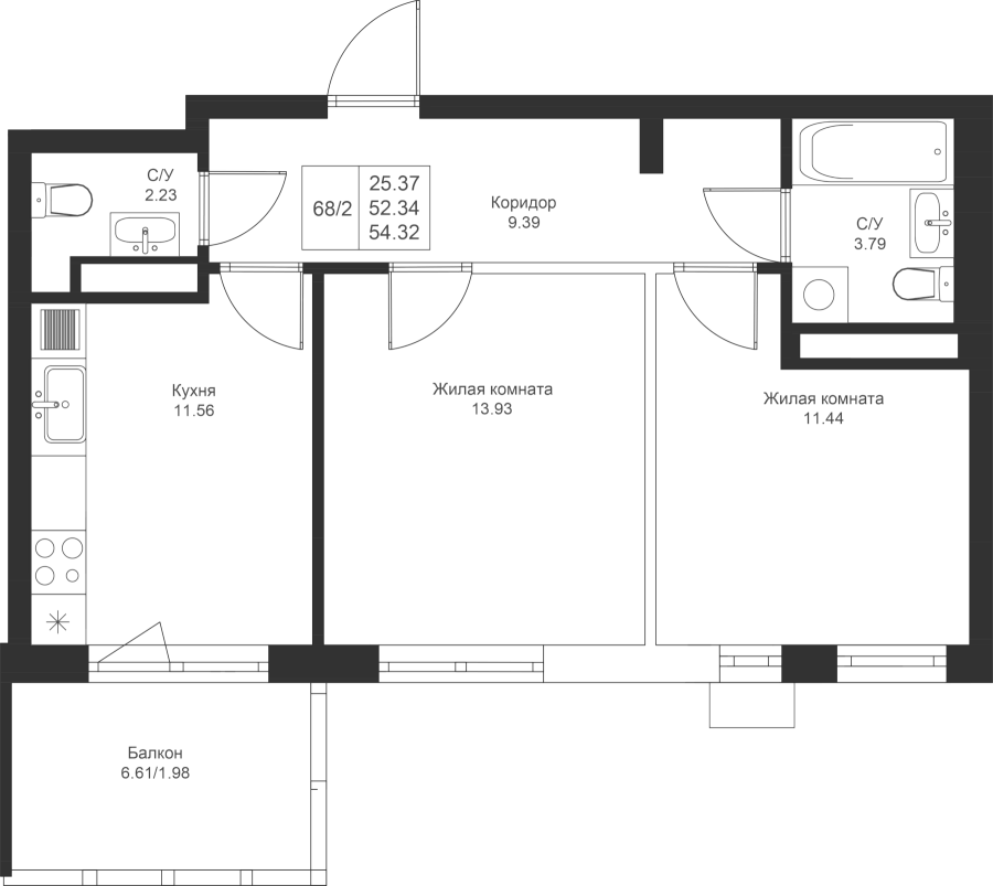 2-к квартира 54.32 м²