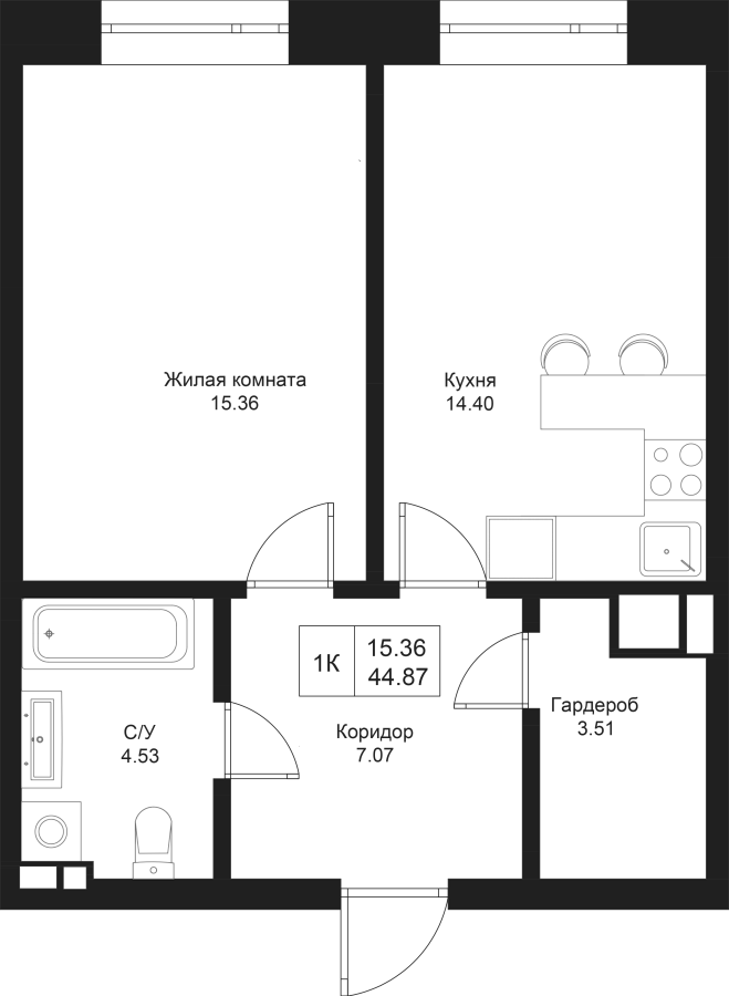 1-к квартира 44.87 м²