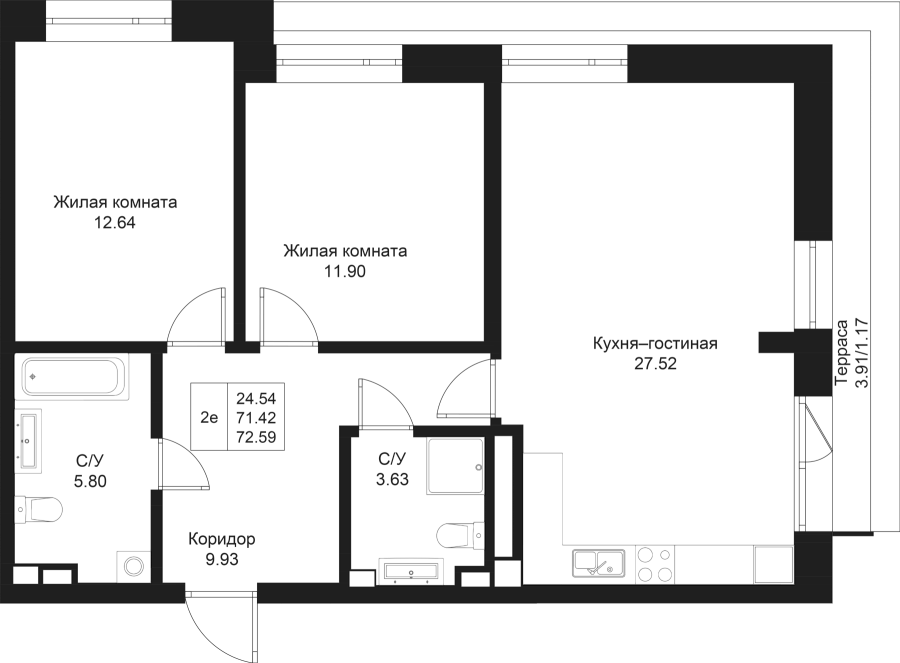 2-к квартира 72.59 м²