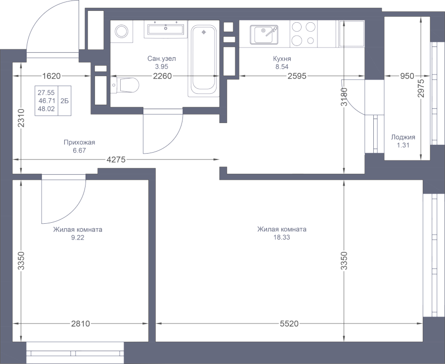 2-к квартира 48.02 м²