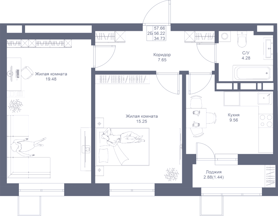 Визуализация и планировка, в том числе в части площади и размера стен жилого помещения, являются проектными и могут быть изменены в ходе строительства объекта. Цена квартиры зависит от выбранной программы и акции, актуальные цены можно уточнить у менеджеров и на момент заключения договора.