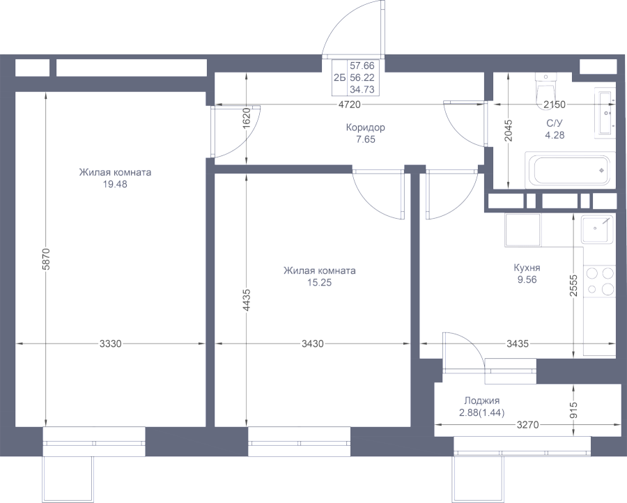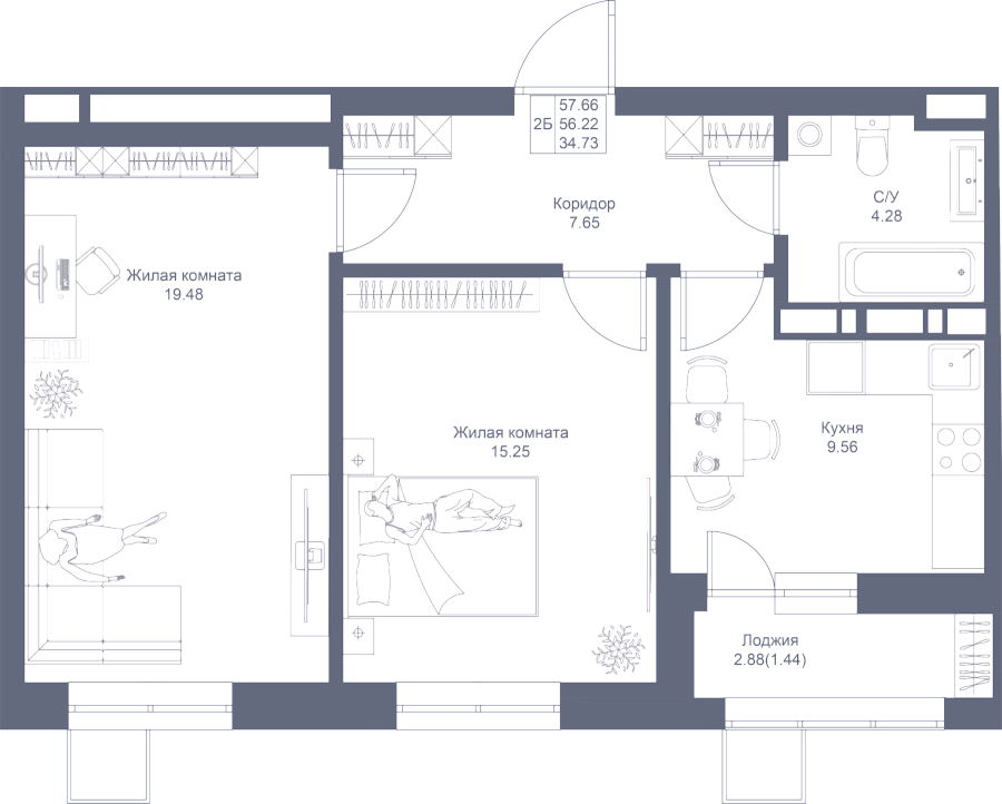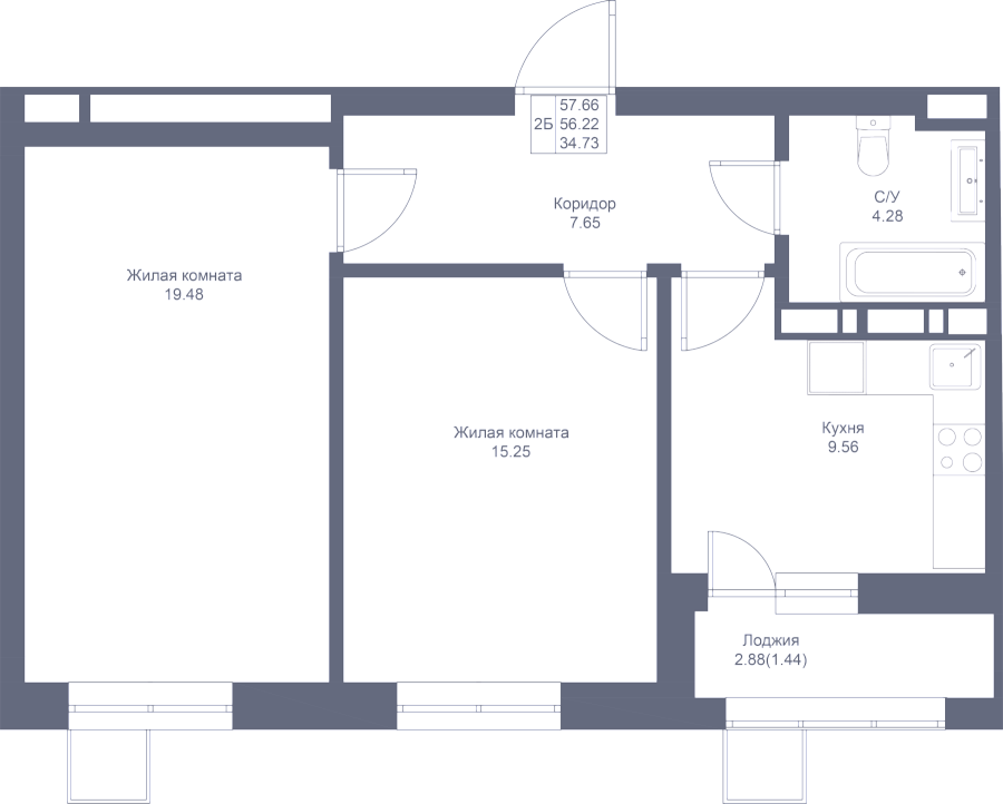 2-к квартира 57.66 м²