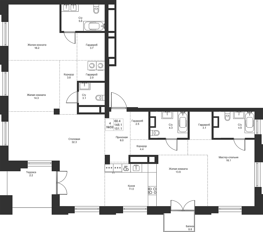 4-к квартира 151.1 м²