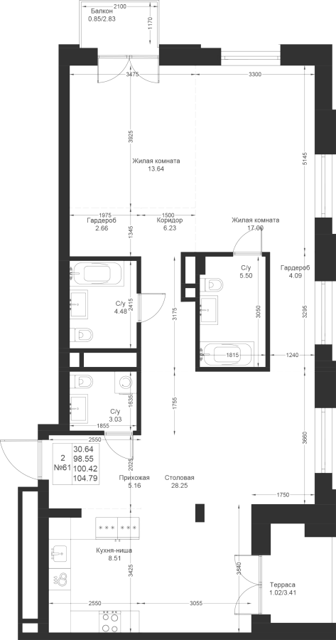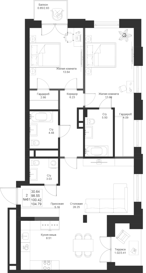 Визуализация и планировка, в том числе в части площади и размера стен жилого помещения, являются проектными и могут быть изменены в ходе строительства объекта. Цена квартиры зависит от выбранной программы и акции, актуальные цены можно уточнить у менеджеров и на момент заключения договора.