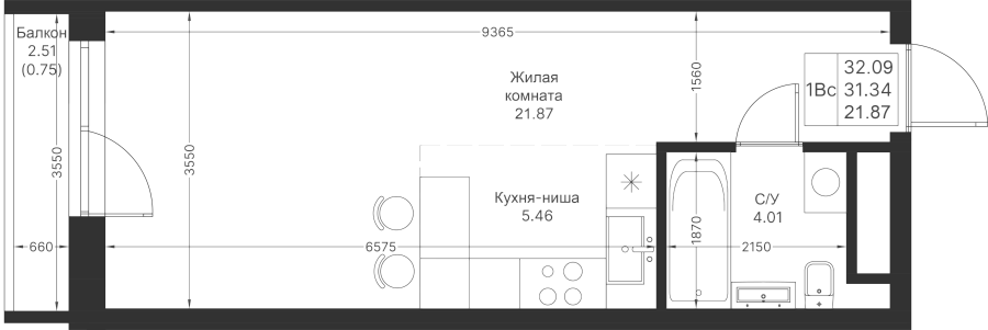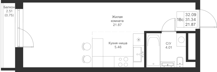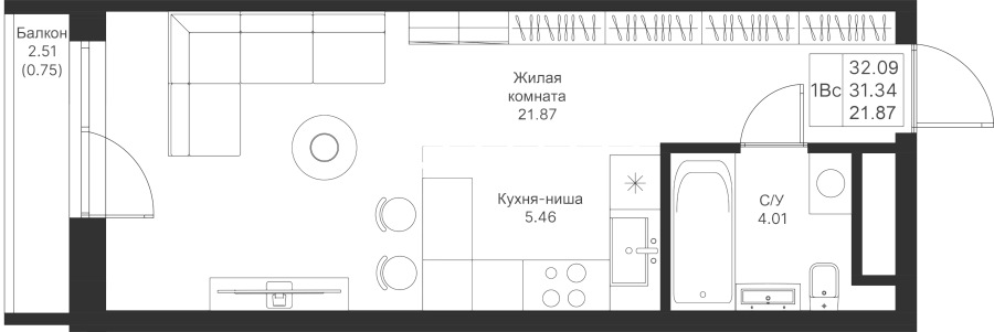 Студия 32.09 м²