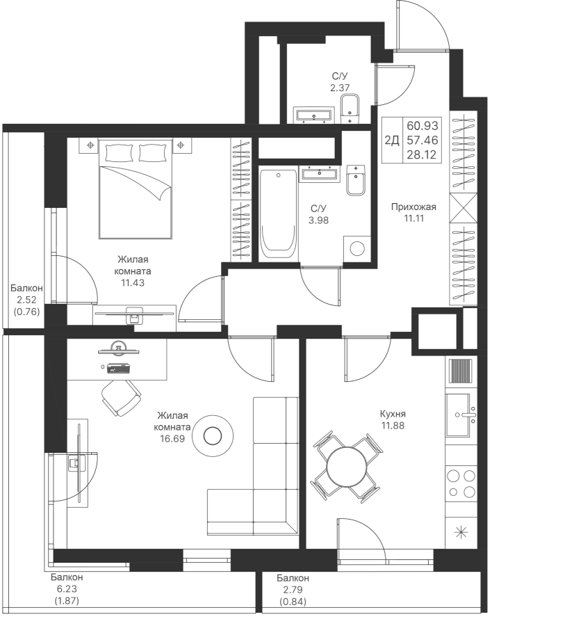 Визуализация и планировка, в том числе в части площади и размера стен жилого помещения, являются проектными и могут быть изменены в ходе строительства объекта. Цена квартиры зависит от выбранной программы и акции, актуальные цены можно уточнить у менеджеров и на момент заключения договора.