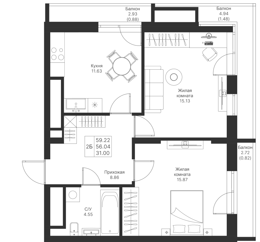 2-к квартира 59.22 м²
