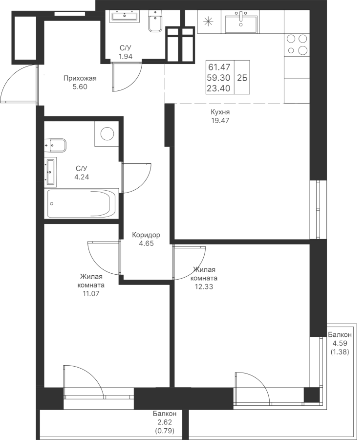 2-к квартира 61.47 м²