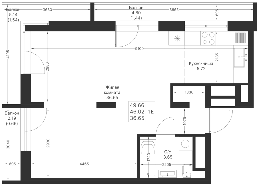 1-к квартира 49.66 м²