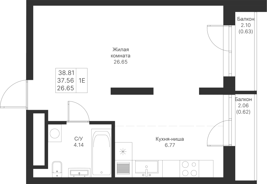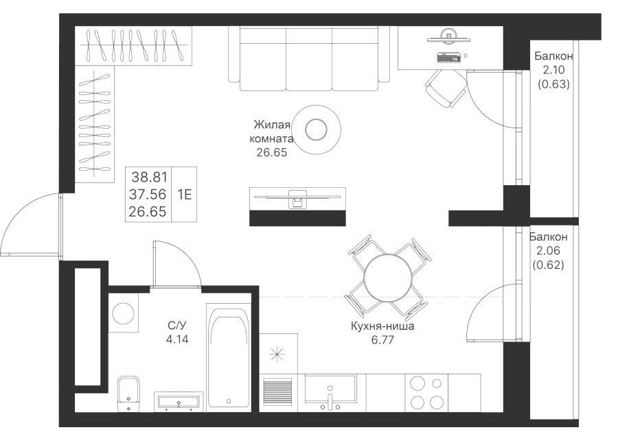 1-к квартира 38.81 м²