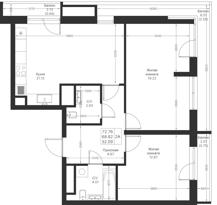 Визуализация и планировка, в том числе в части площади и размера стен жилого помещения, являются проектными и могут быть изменены в ходе строительства объекта. Цена квартиры зависит от выбранной программы и акции, актуальные цены можно уточнить у менеджеров и на момент заключения договора.
