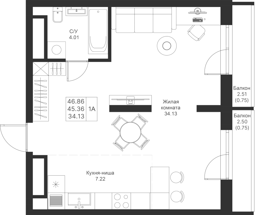 1-к квартира 46.86 м²
