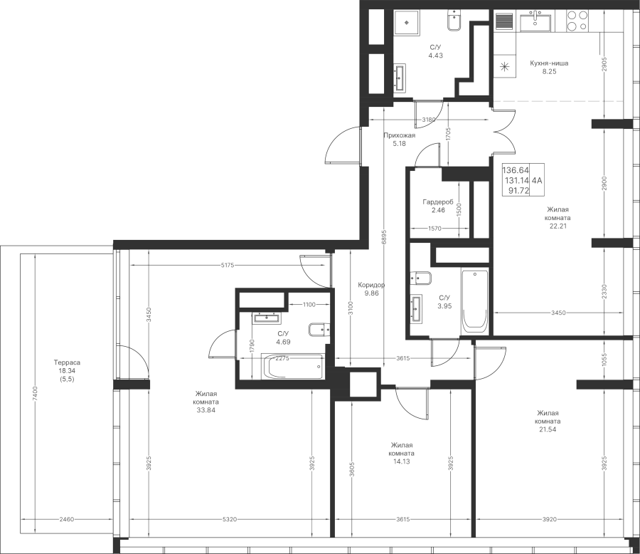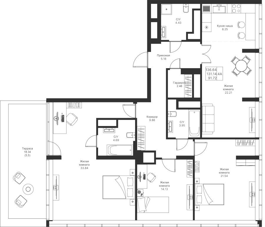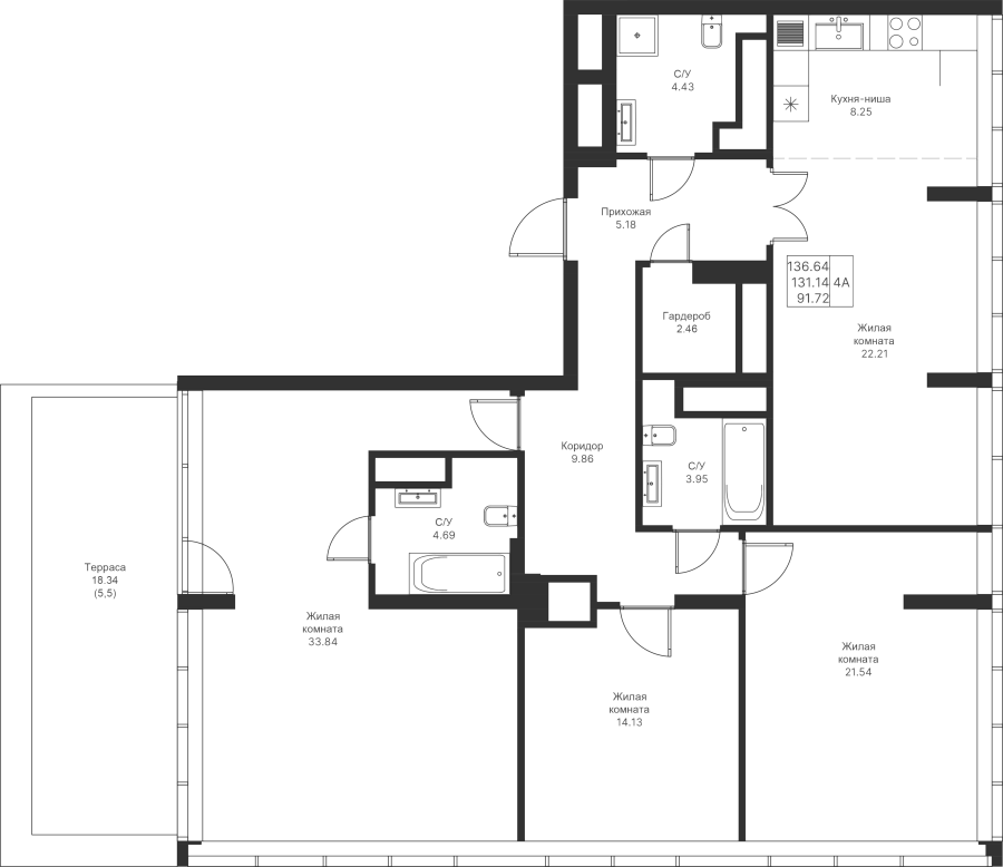 4-к квартира 136.64 м²