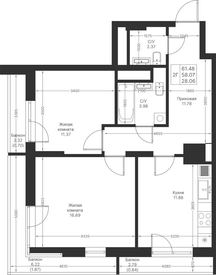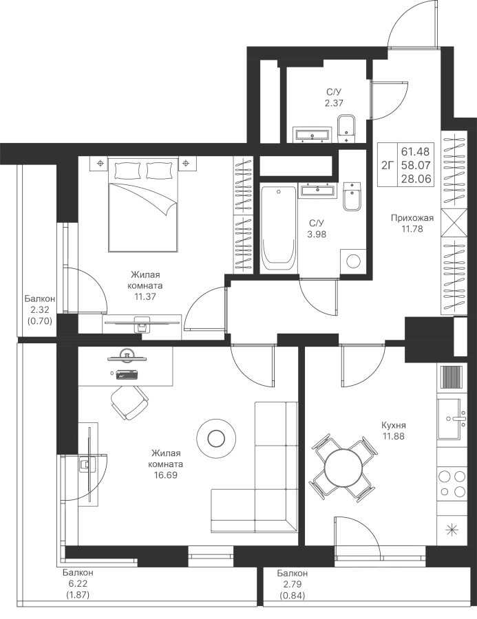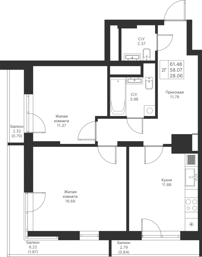 Визуализация и планировка, в том числе в части площади и размера стен жилого помещения, являются проектными и могут быть изменены в ходе строительства объекта. Цена квартиры зависит от выбранной программы и акции, актуальные цены можно уточнить у менеджеров и на момент заключения договора.