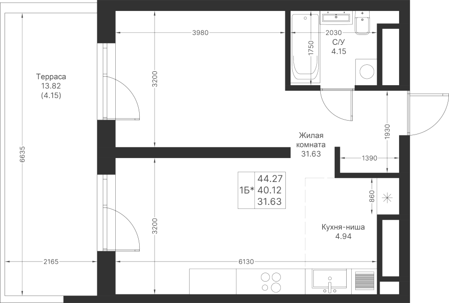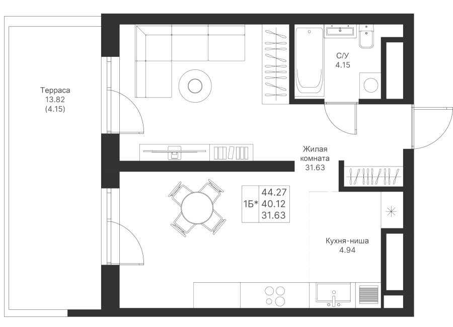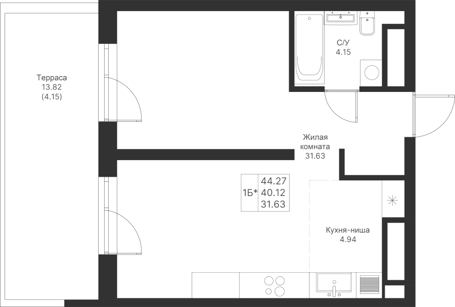1-к квартира 44.27 м²