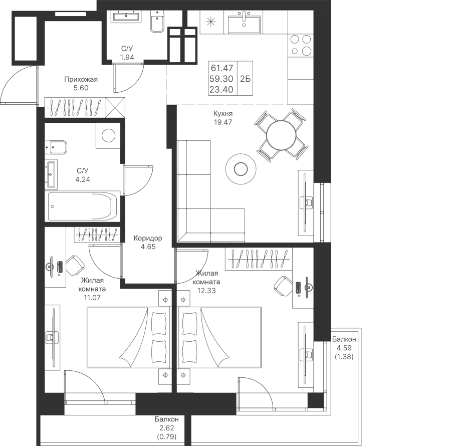 Визуализация и планировка, в том числе в части площади и размера стен жилого помещения, являются проектными и могут быть изменены в ходе строительства объекта. Цена квартиры зависит от выбранной программы и акции, актуальные цены можно уточнить у менеджеров и на момент заключения договора.