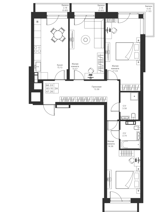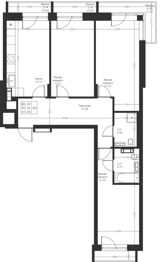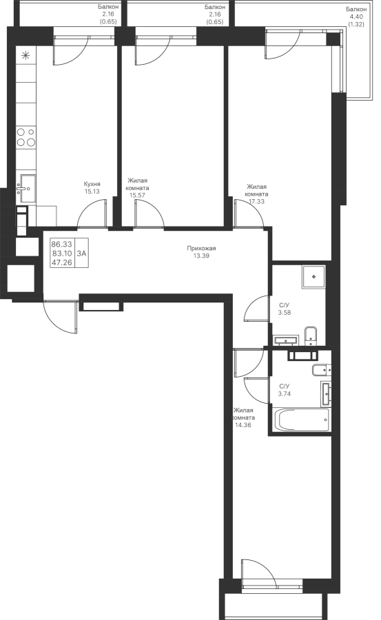 3-к квартира 86.33 м²
