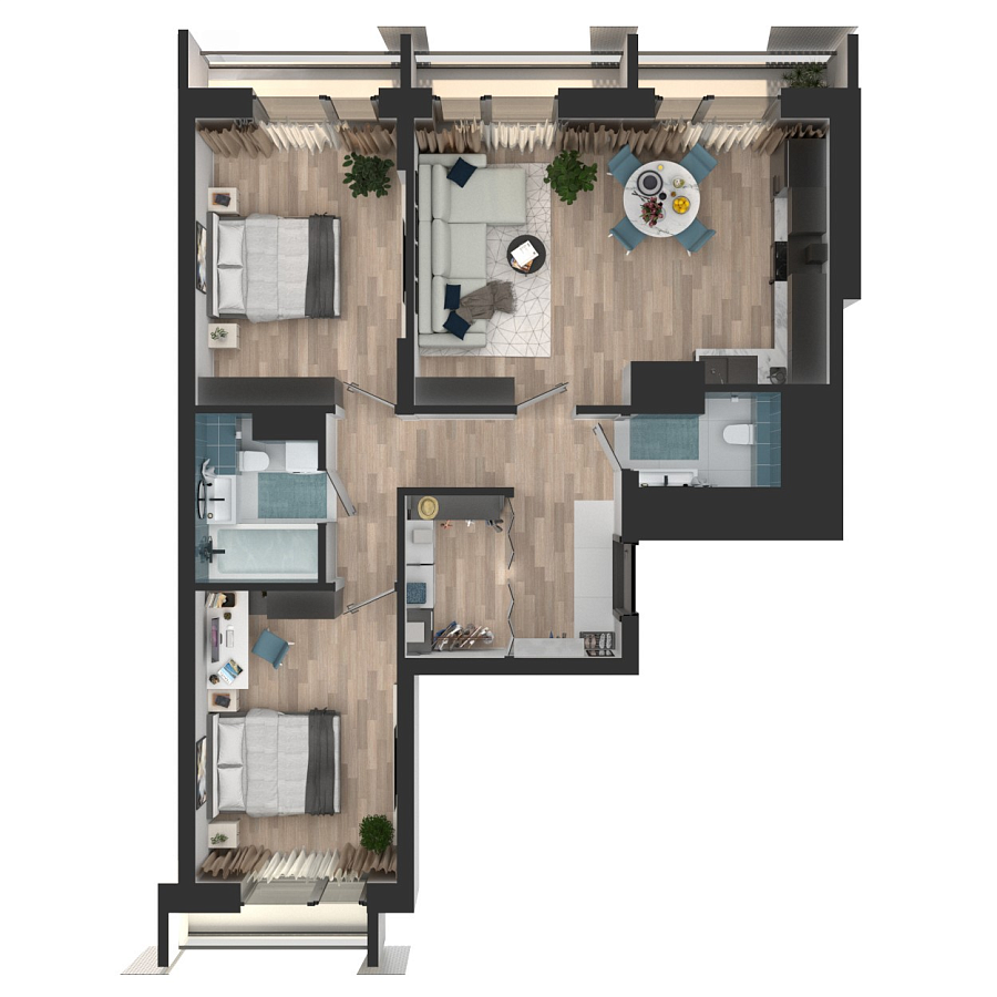 Визуализация и планировка, в том числе в части площади и размера стен жилого помещения, являются проектными и могут быть изменены в ходе строительства объекта. Цена квартиры зависит от выбранной программы и акции, актуальные цены можно уточнить у менеджеров и на момент заключения договора.