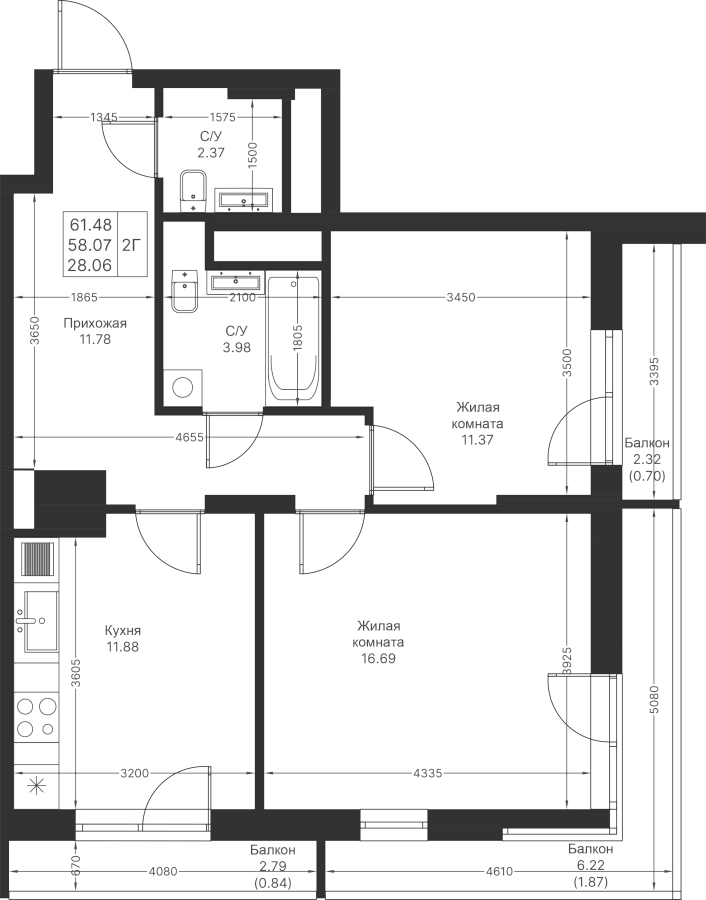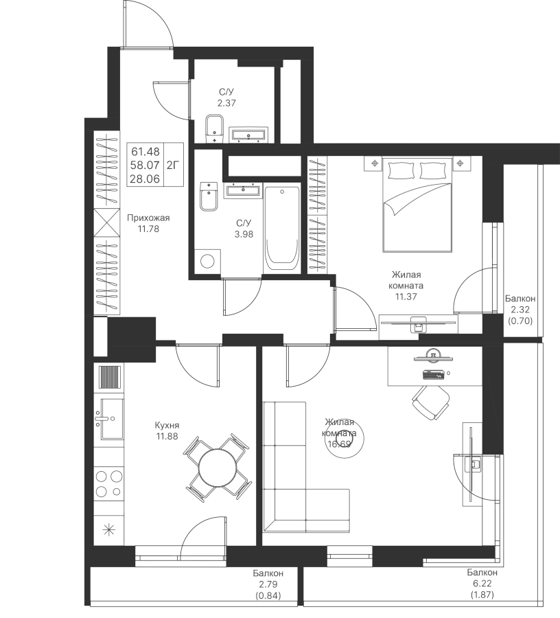 Визуализация и планировка, в том числе в части площади и размера стен жилого помещения, являются проектными и могут быть изменены в ходе строительства объекта. Цена квартиры зависит от выбранной программы и акции, актуальные цены можно уточнить у менеджеров и на момент заключения договора.