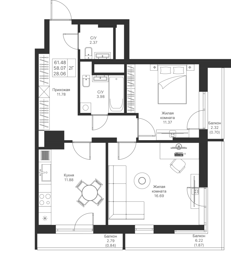 Визуализация и планировка, в том числе в части площади и размера стен жилого помещения, являются проектными и могут быть изменены в ходе строительства объекта. Цена квартиры зависит от выбранной программы и акции, актуальные цены можно уточнить у менеджеров и на момент заключения договора.