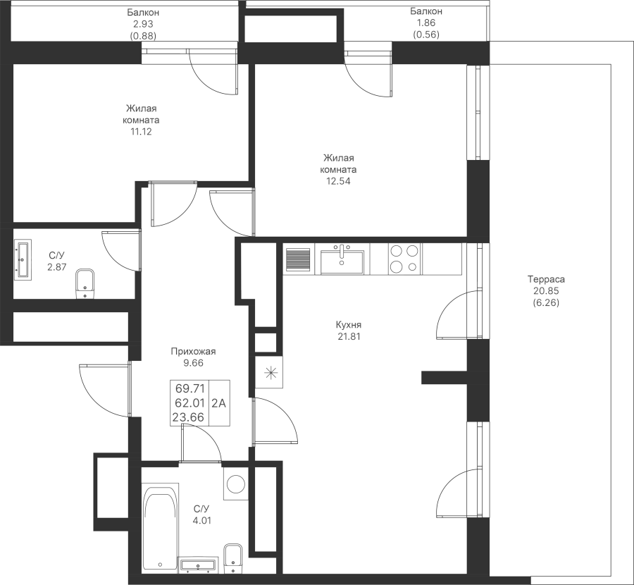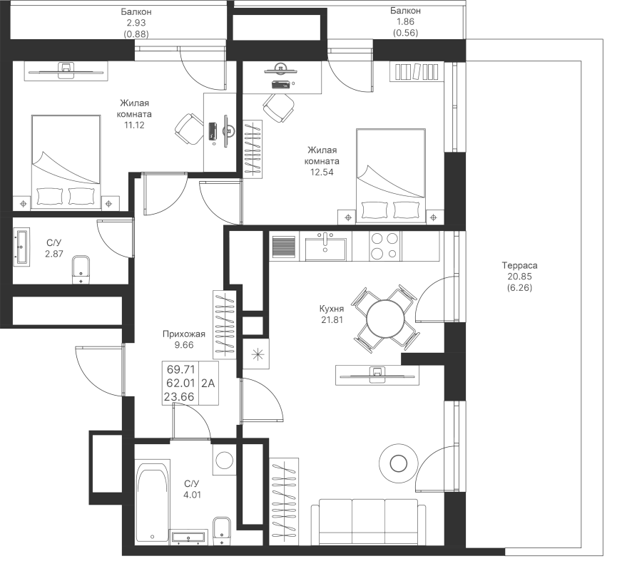 Визуализация и планировка, в том числе в части площади и размера стен жилого помещения, являются проектными и могут быть изменены в ходе строительства объекта. Цена квартиры зависит от выбранной программы и акции, актуальные цены можно уточнить у менеджеров и на момент заключения договора.