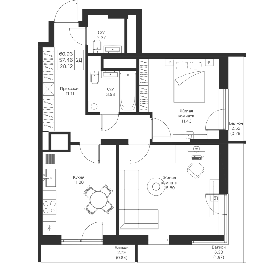 Визуализация и планировка, в том числе в части площади и размера стен жилого помещения, являются проектными и могут быть изменены в ходе строительства объекта. Цена квартиры зависит от выбранной программы и акции, актуальные цены можно уточнить у менеджеров и на момент заключения договора.
