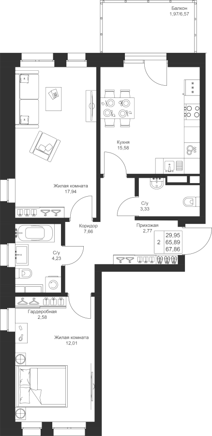 Визуализация и планировка, в том числе в части площади и размера стен жилого помещения, используемых цветовых решений на плане являются проектными и могут быть изменены в ходе строительства объекта. Цена квартиры зависит от выбранной программы и акции, актуальные цены можно уточнить у менеджеров и на момент заключения договора.