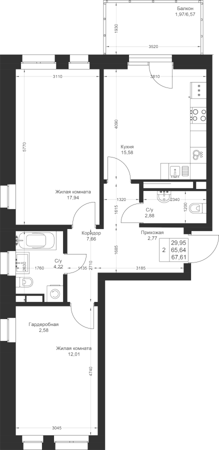 2-к квартира 67.61 м²