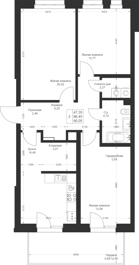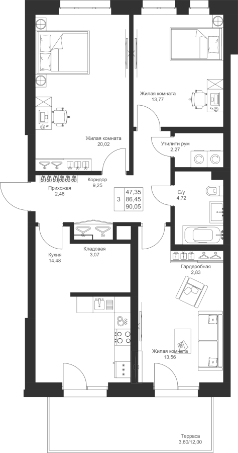 3-к квартира 90.05 м²
