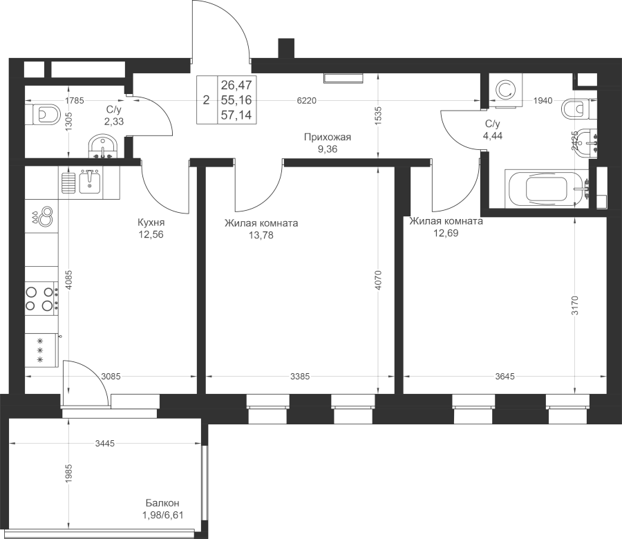 2-к квартира 57.14 м²
