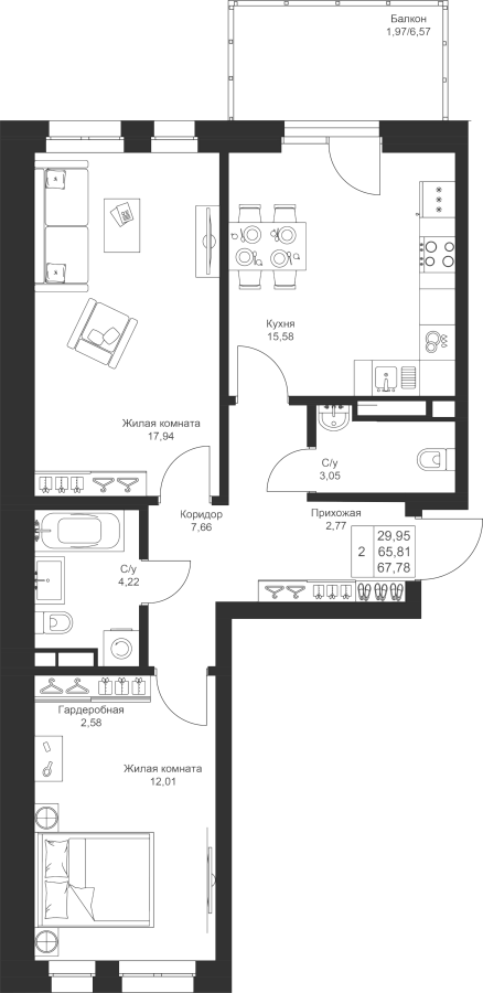 Визуализация и планировка, в том числе в части площади и размера стен жилого помещения, используемых цветовых решений на плане являются проектными и могут быть изменены в ходе строительства объекта. Цена квартиры зависит от выбранной программы и акции, актуальные цены можно уточнить у менеджеров и на момент заключения договора.