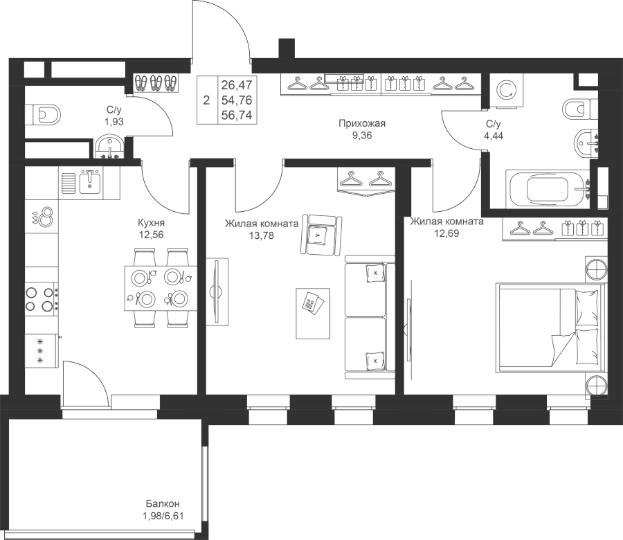 Визуализация и планировка, в том числе в части площади и размера стен жилого помещения, используемых цветовых решений на плане являются проектными и могут быть изменены в ходе строительства объекта. Цена квартиры зависит от выбранной программы и акции, актуальные цены можно уточнить у менеджеров и на момент заключения договора.