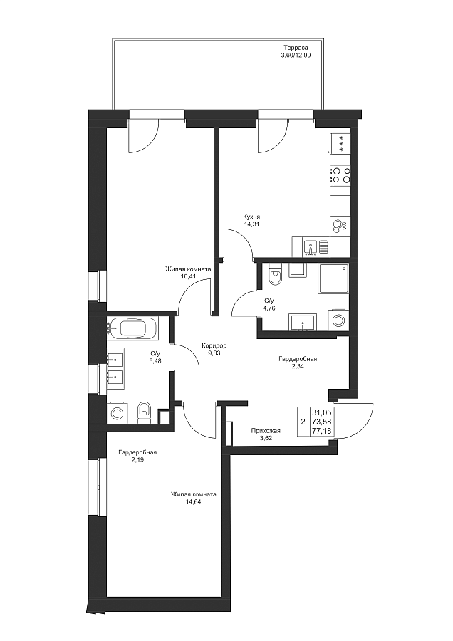 2-к квартира 77.18 м²