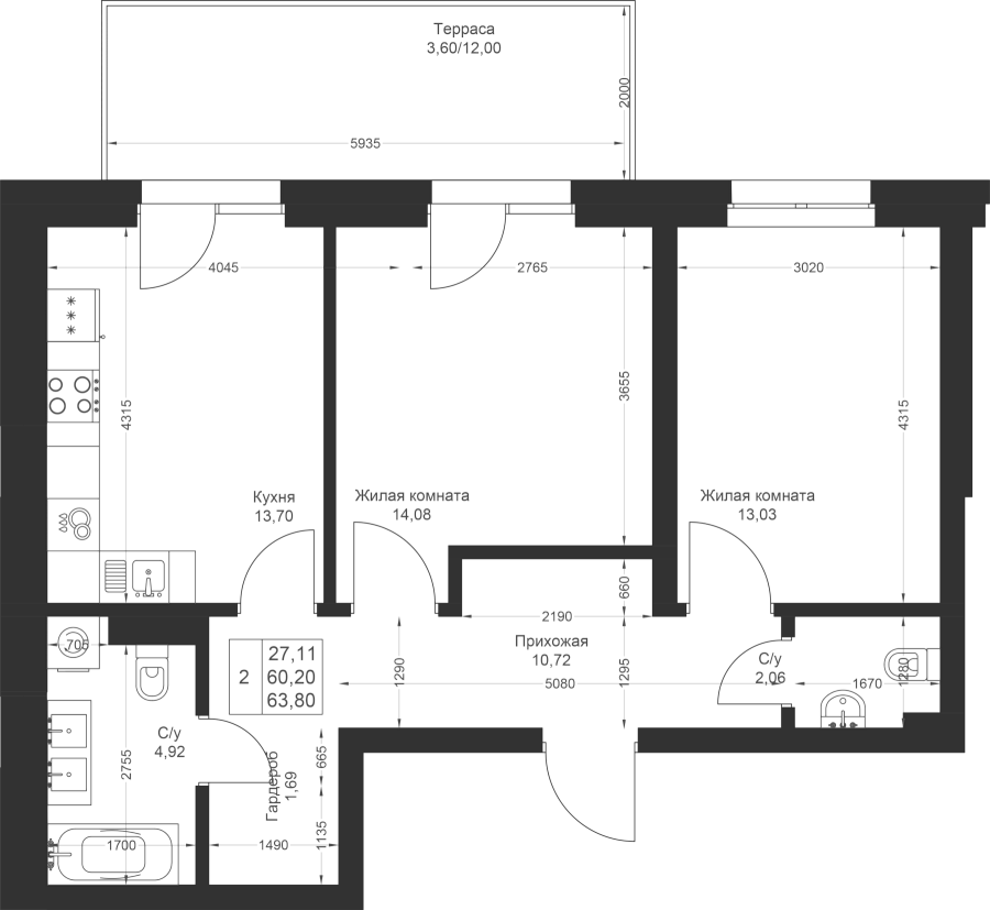 2-к квартира 63.8 м²
