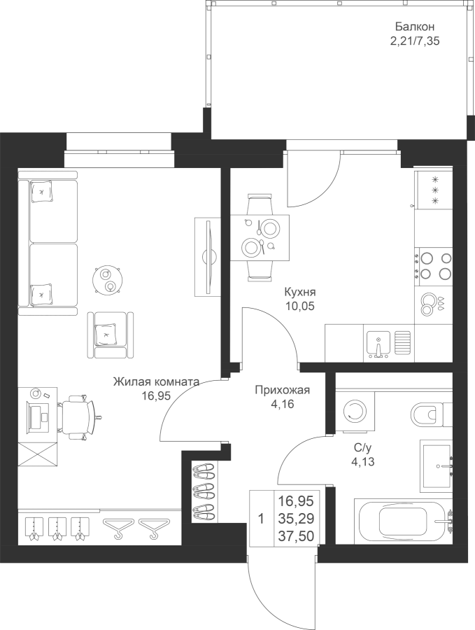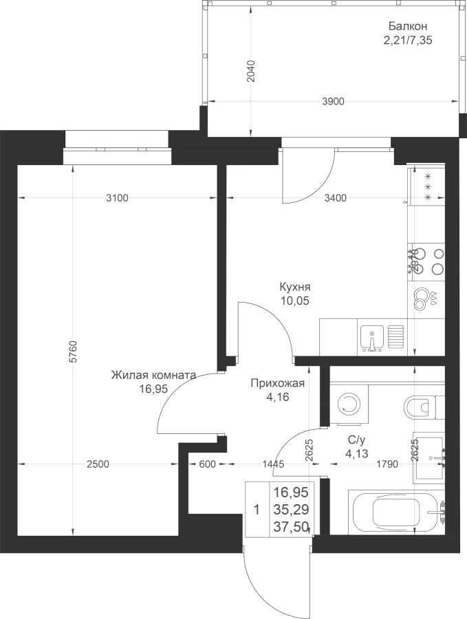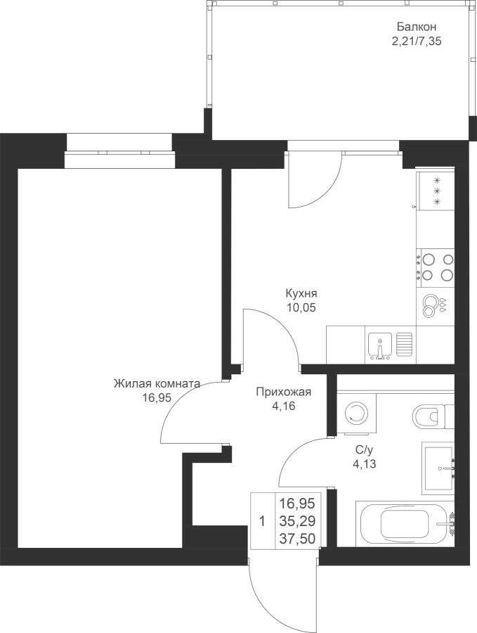 1-к квартира 37.5 м²