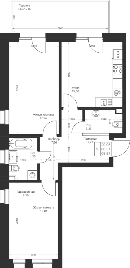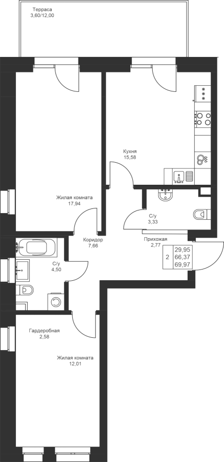 2-к квартира 69.97 м²