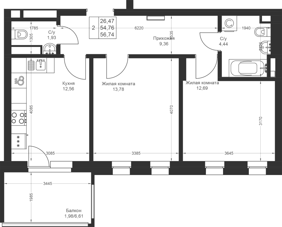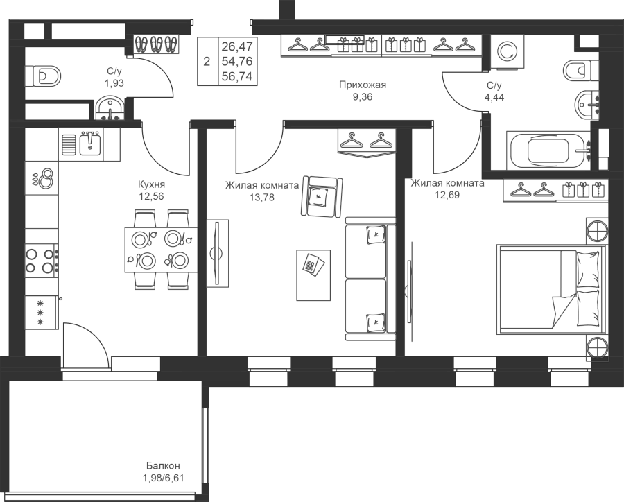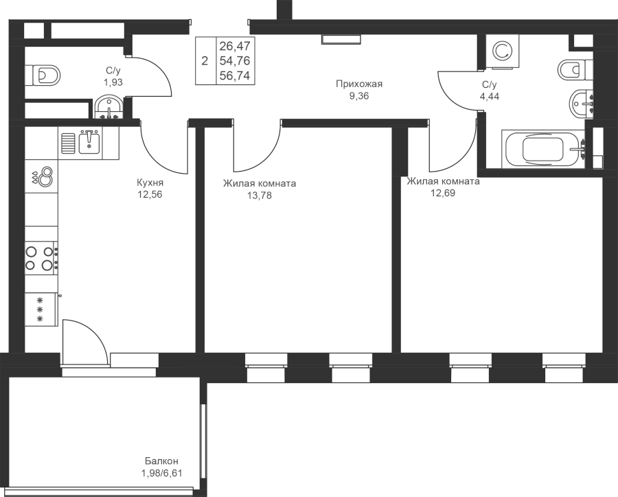 2-к квартира 56.74 м²