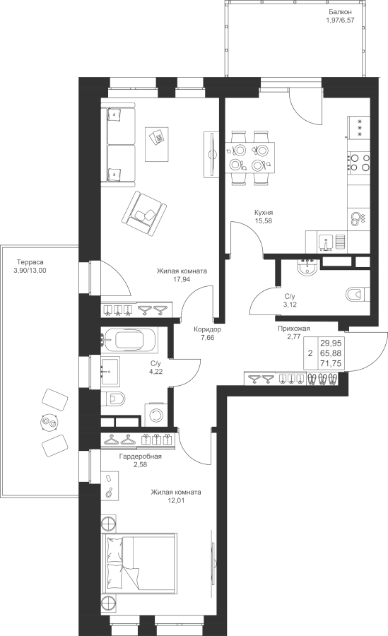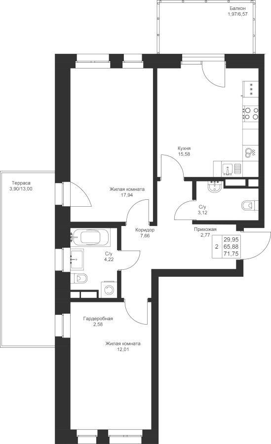 2-к квартира 71.75 м²
