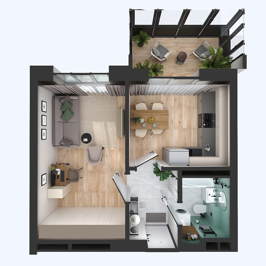 Визуализация и планировка, в том числе в части площади и размера стен жилого помещения, используемых цветовых решений на плане являются проектными и могут быть изменены в ходе строительства объекта. Цена квартиры зависит от выбранной программы и акции, актуальные цены можно уточнить у менеджеров и на момент заключения договора.