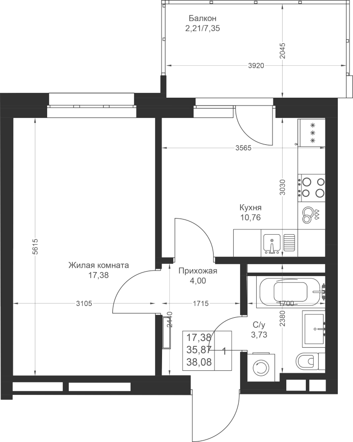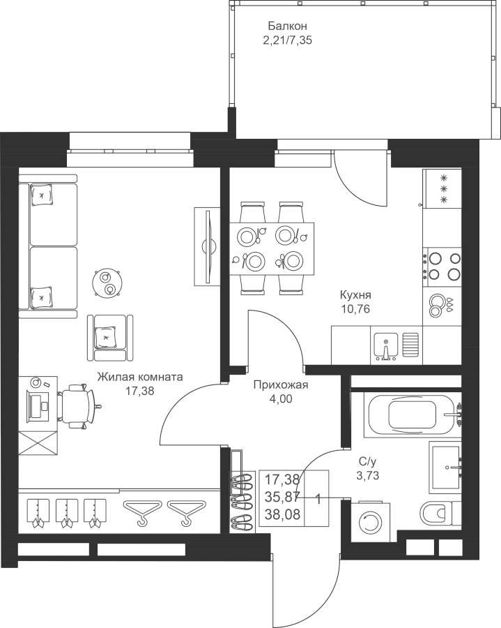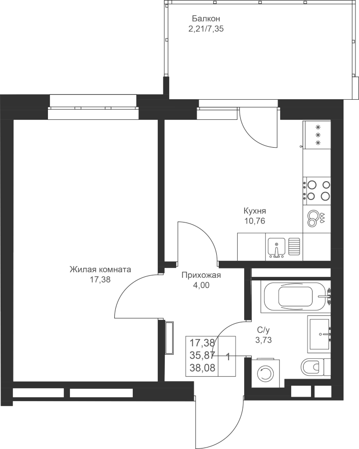 1-к квартира 38.08 м²