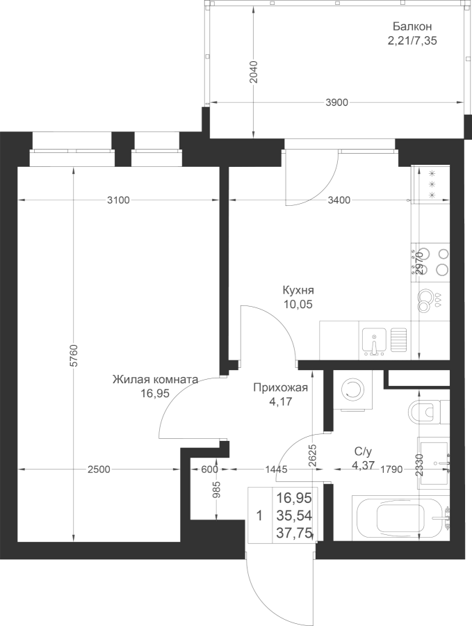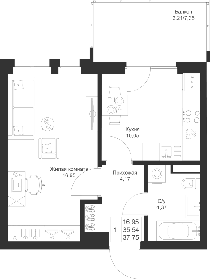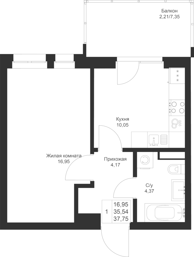 1-к квартира 37.75 м²