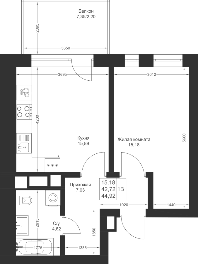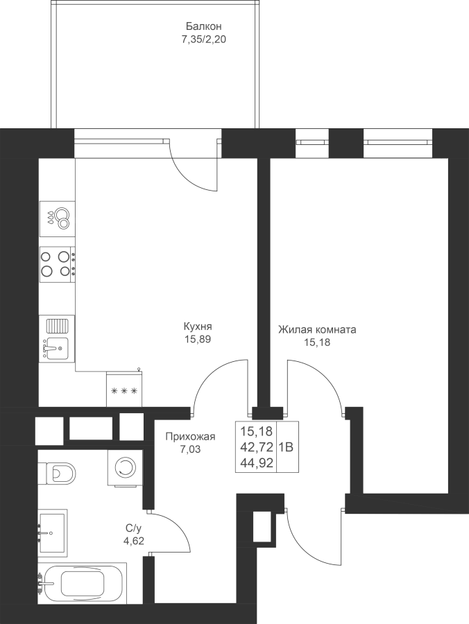 1-к квартира 44.92 м²