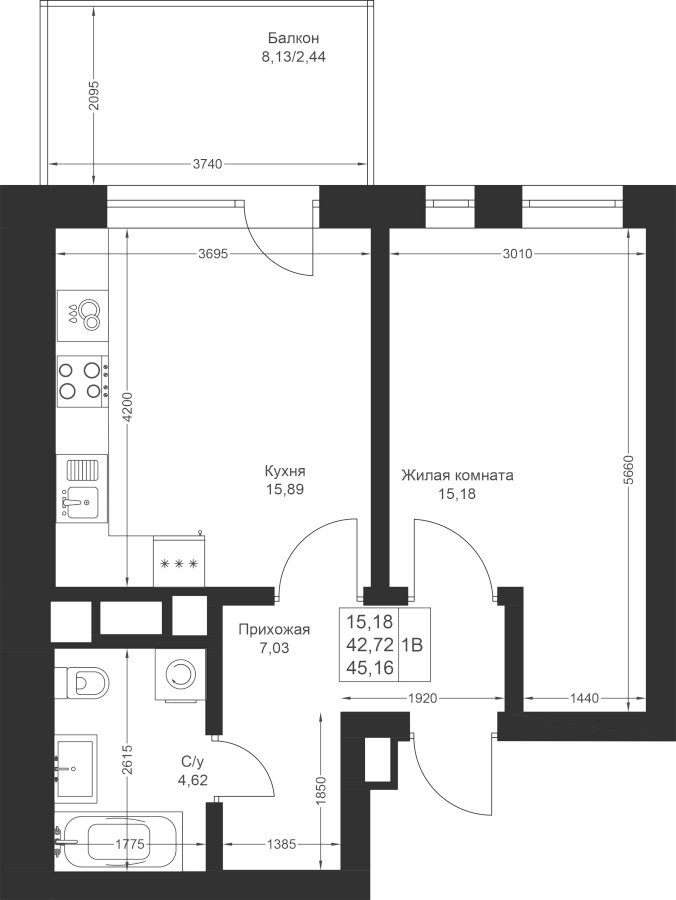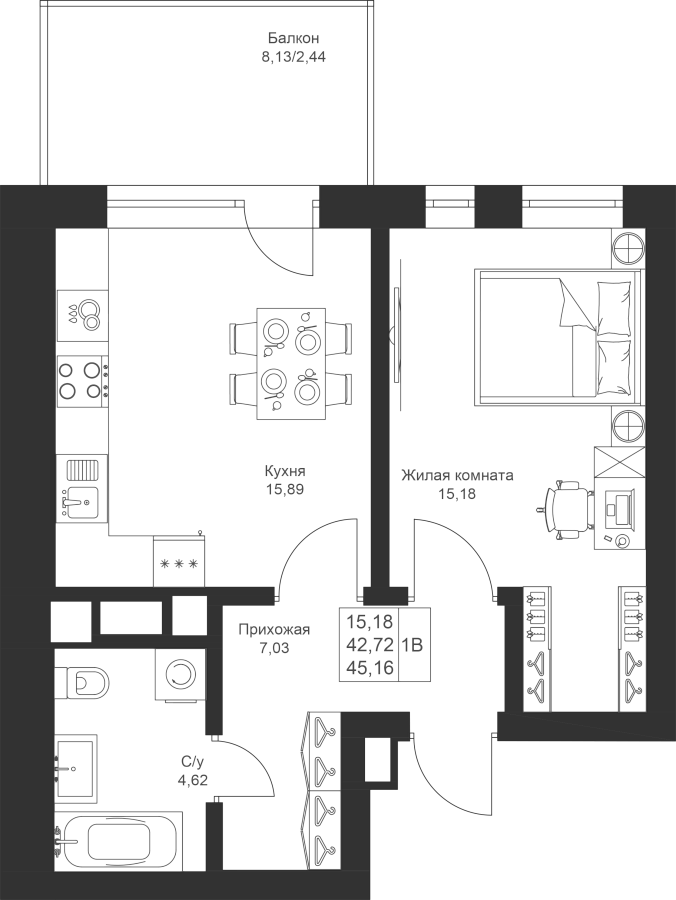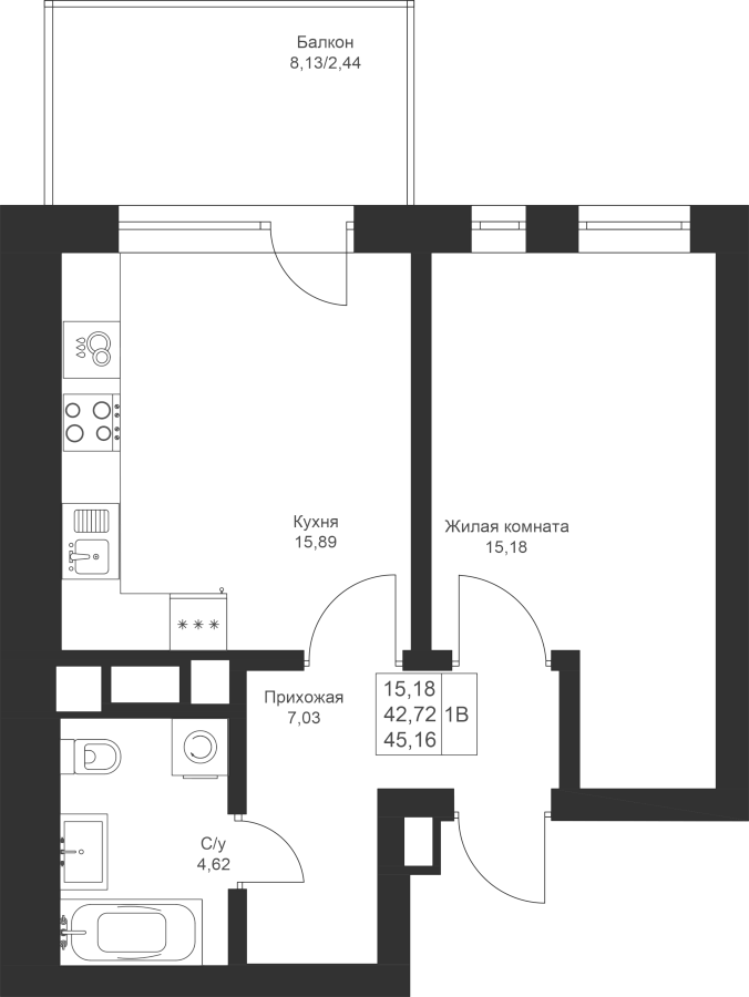1-к квартира 45.16 м²