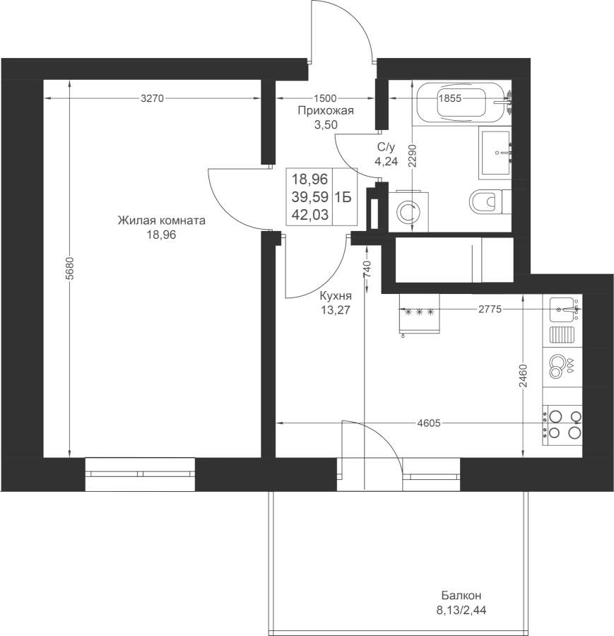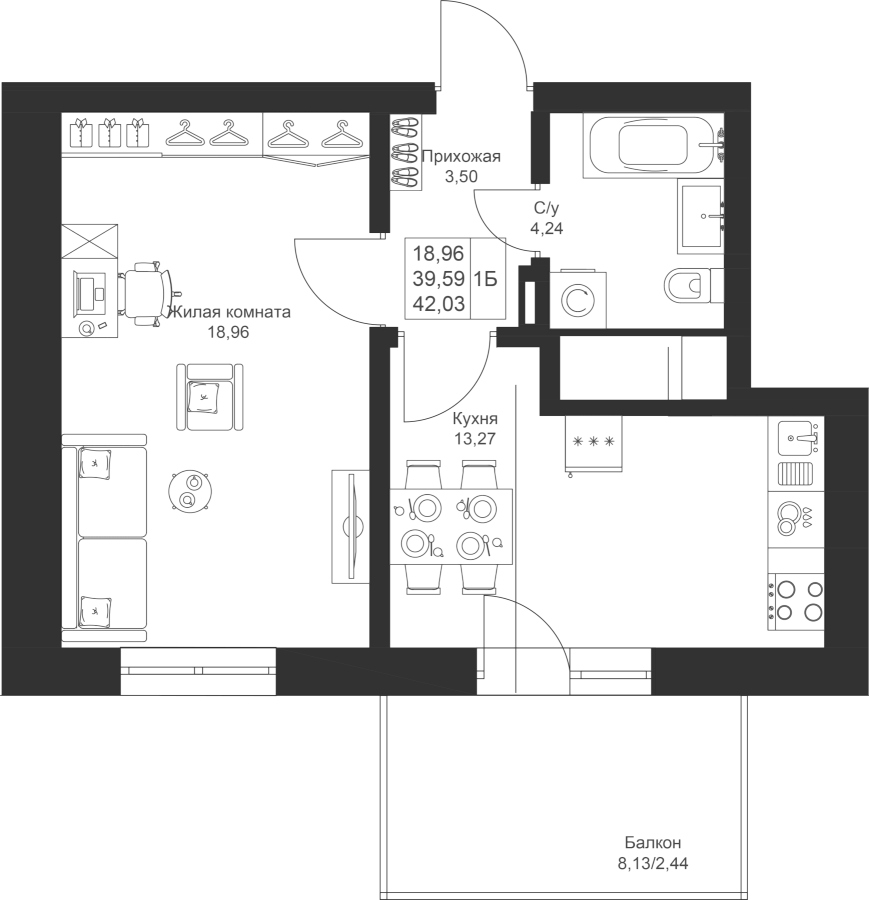 1-к квартира 42.03 м²
