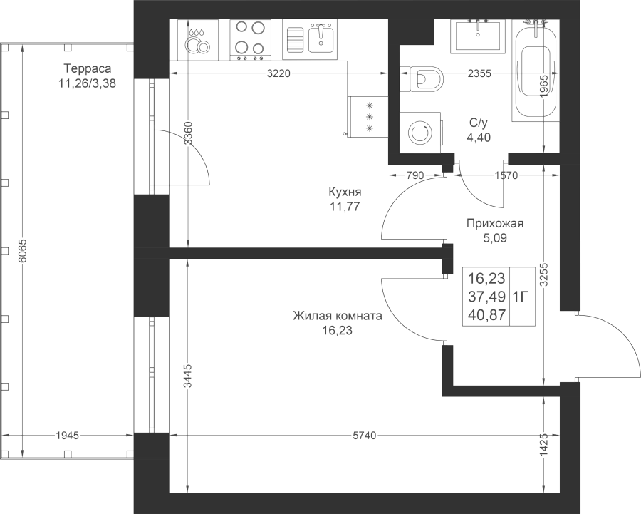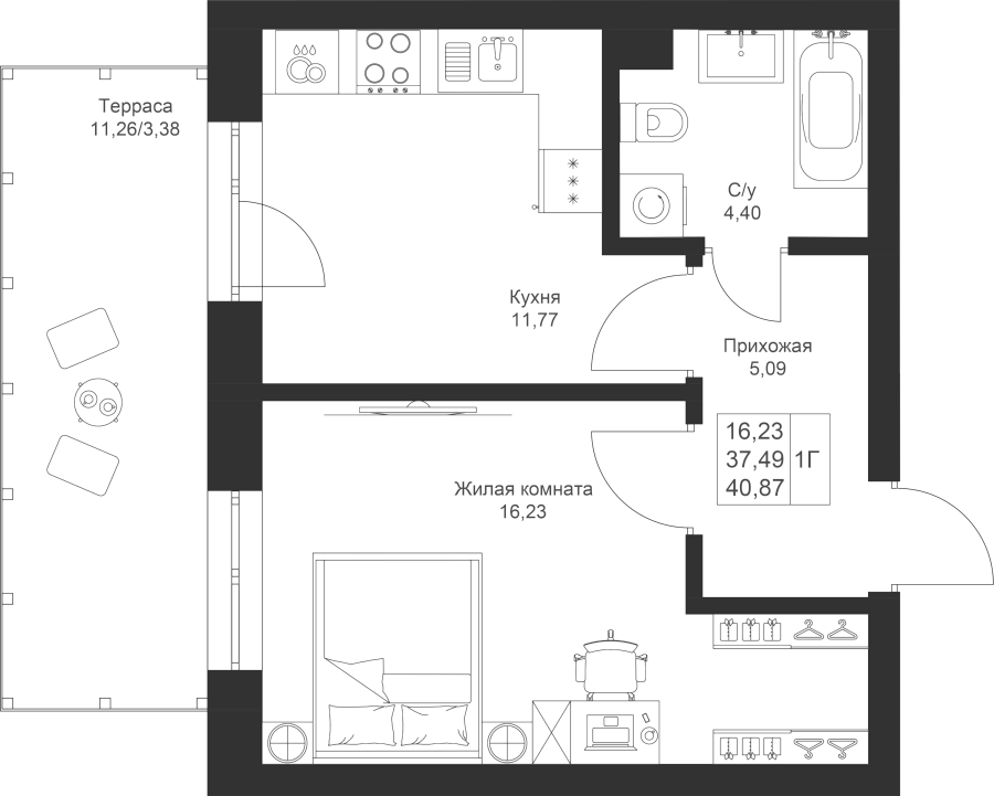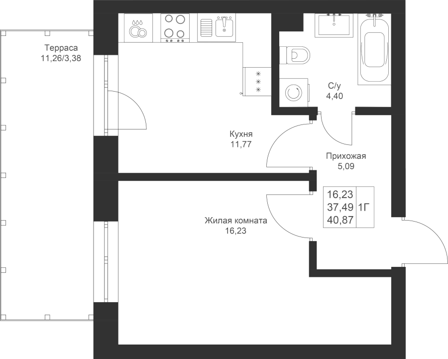1-к квартира 40.87 м²