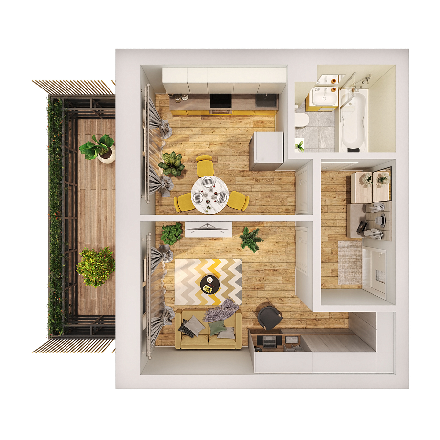 Визуализация и планировка, в том числе в части площади и размера стен жилого помещения, используемых цветовых решений на плане являются проектными и могут быть изменены в ходе строительства объекта. Цена квартиры зависит от выбранной программы и акции, актуальные цены можно уточнить у менеджеров и на момент заключения договора.