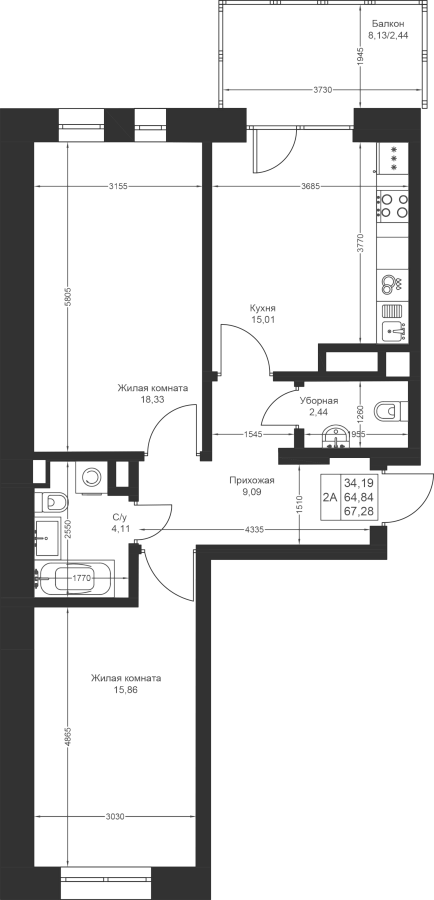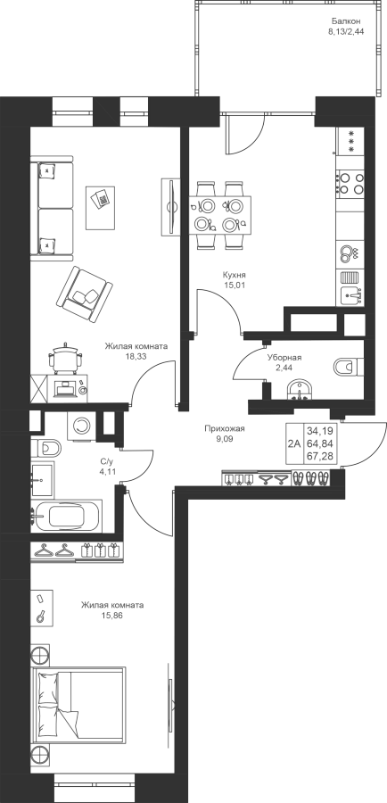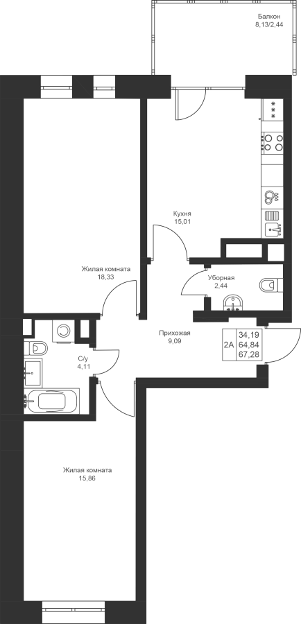 2-к квартира 67.28 м²