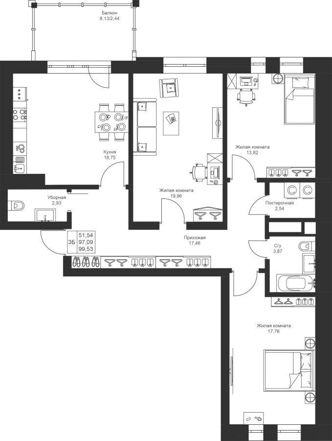 Визуализация и планировка, в том числе в части площади и размера стен жилого помещения, являются проектными и могут быть изменены в ходе строительства объекта. Цена квартиры зависит от выбранной программы и акции, актуальные цены можно уточнить у менеджеров и на момент заключения договора.