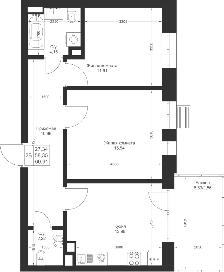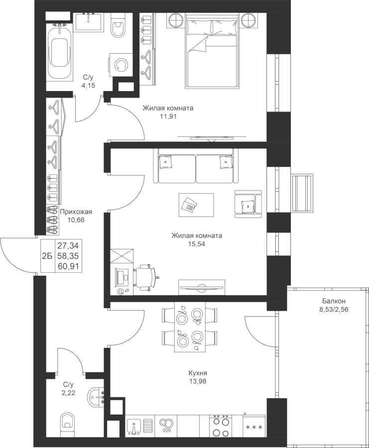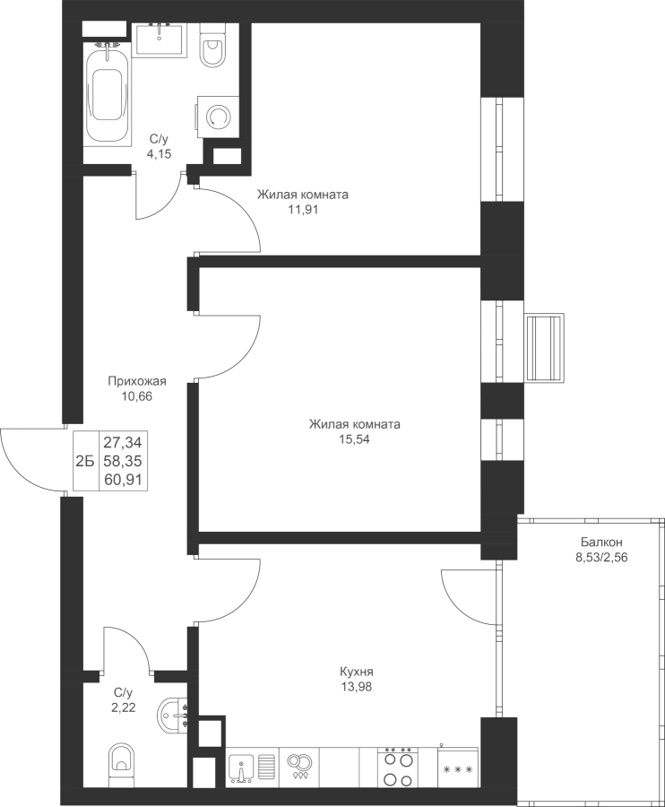 2-к квартира 60.91 м²